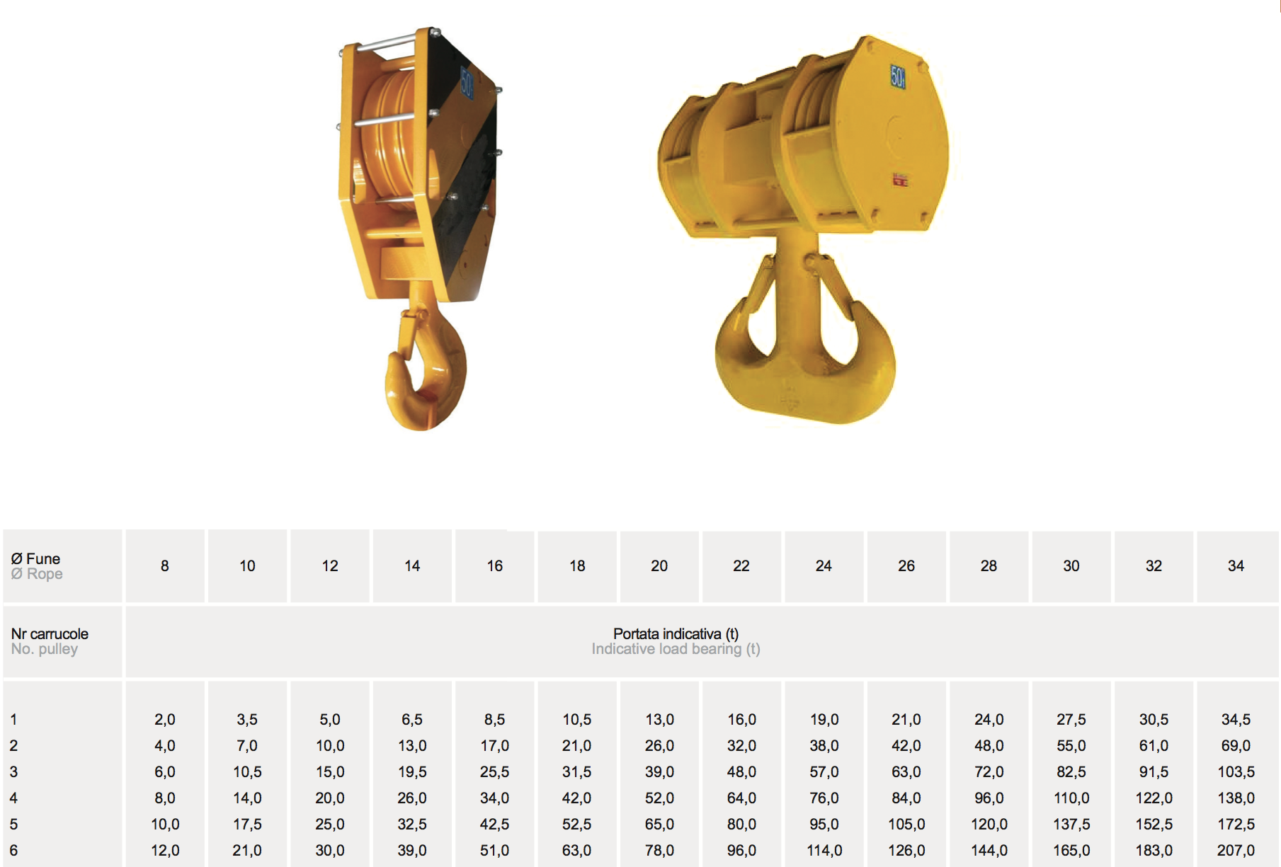 *Le portate riportate sono considerate per bozzelli senza capofisso. Il capofisso aumenta la portata del bozzello.